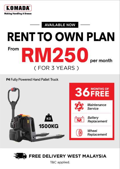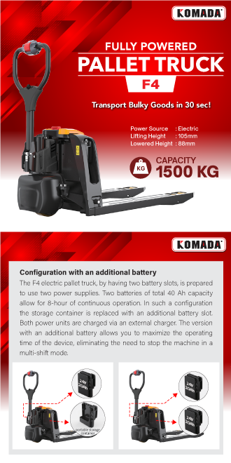 KOMADA F4 - 1.5 Ton Electric Hand Pallet Truck Pedal brings maximum flexibility in configurations for every application. The standard single 24V/20Ah battery setting comes with a portable storage container to keep everything easily accessible on the go. Its versatilty makes F4 an all rounder, perfect for diverse tasks in the most cost effective way.