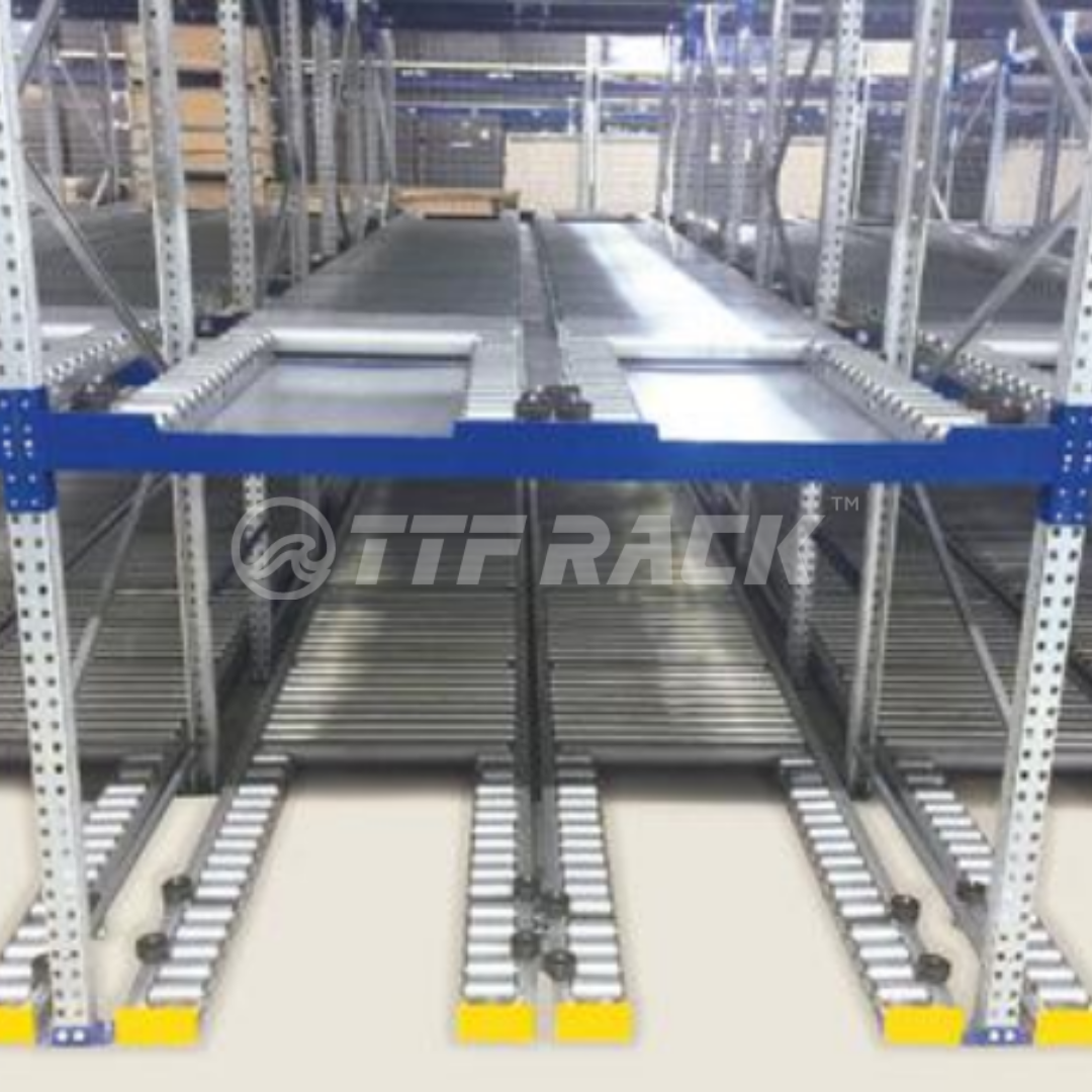 Gravity-Powered: Using inclined rails, this system allows pallets to glide from the loading area to the picking area using gravity, reducing the need for forklifts or additional manpower.