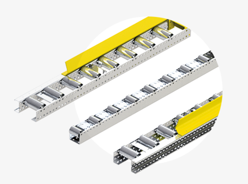 Designed for optimal efficiency, our material handling equipment features a tilting mast and automated conveyor loading. To enhance safety for forklift operators, the entry guides are clearly marked with a yellow signal color, ensuring precise positioning. Additionally, roller protection is implemented to prevent damage during daily operations, and in automated systems, reinforced rollers are included for added durability.