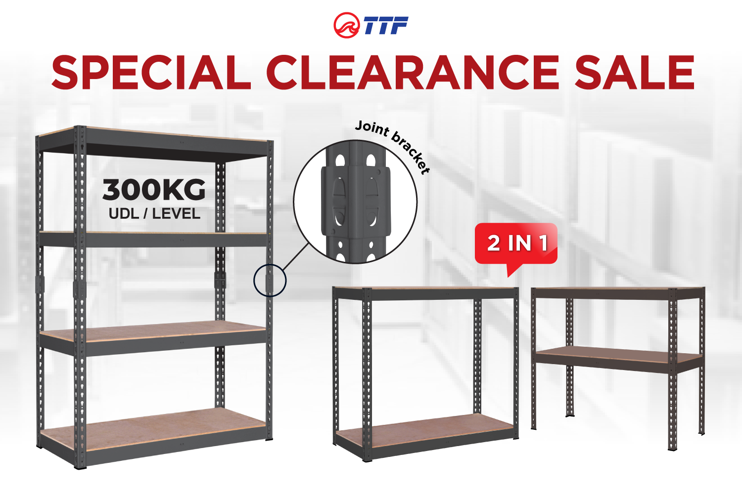 2 in 1 E-Boltless Rack can be installed in all in one, or dividing the rack at 2 in 1. Every level can load weight up to 300KG UDL / Level.